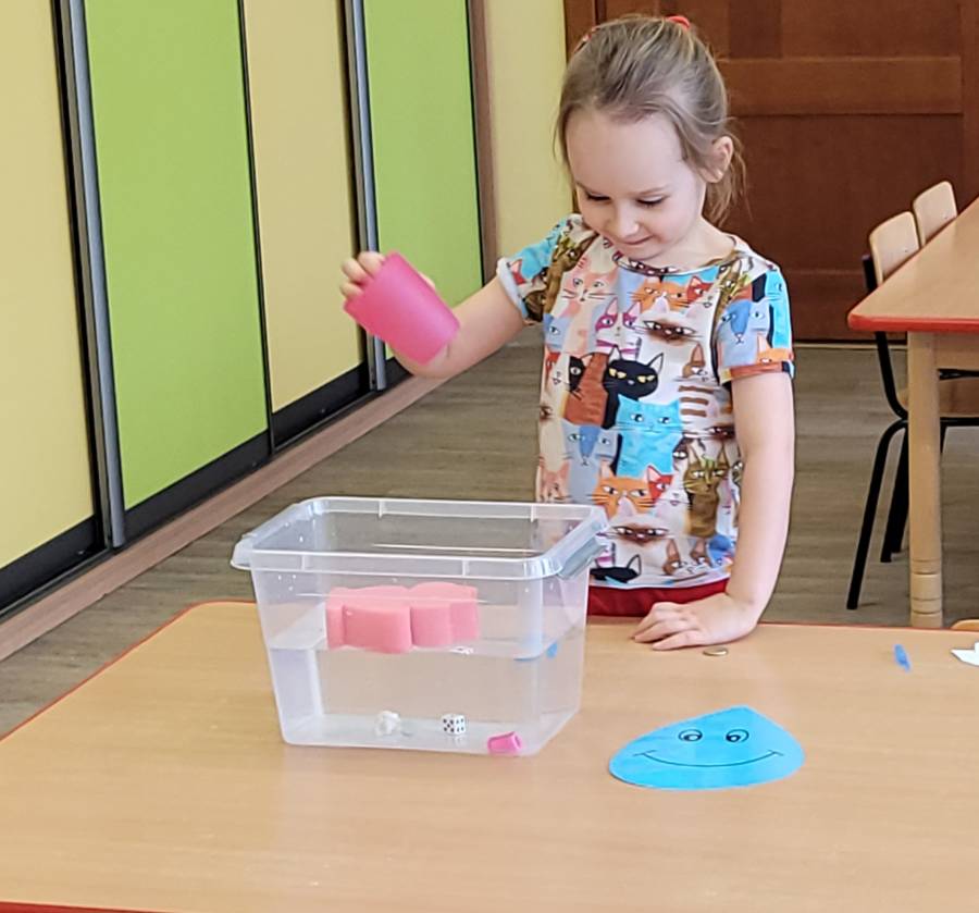 Na dzisiejszych zajęciach grupa Żabki wysłuchała wiersza pt. Woda. Dzieci wspólnie zastanawiały się do czego jest nam potrzebna woda. Próbowały odpowiedzieć także na pytanie co by było gdyby zabrakło wody? Przedszkolaki chętnie interpretowały ruchem piosenkę Deszczyk pada oraz Rain go away. Nastepnie wykonaliśmy doświadczenie Co pływa, a co tonie? Dzieci z zaciekawieniem obserwowały kolejno wrzucane do wody przedmioty. Na zakończenie wspólnie wyciągaliśmy wnioski dlaczego niektóre przedmioty unoszą się, a inne zatapiają.